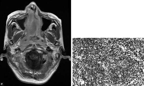 图1a~b,分别为平扫CT、增强CT。双侧鼻腔内不规则软组织密度肿块影,向前侵及鼻前庭、鼻翼;鼻中隔、中下鼻甲及双侧上颌窦内侧壁骨质破坏;向后累及鼻咽后壁。增强扫描病灶轻-中度强化(CT值由43HU升至59HU)。图1c~f,分别为双侧鼻腔内肿物呈近似等T1、T2信号,病灶向前侵及鼻前庭、鼻翼。向后累及鼻咽后壁及双侧咽旁间隙。向右突入至上颌窦内、累及眶内壁。向左挤压左侧上颌窦内侧壁。增强扫描病灶轻-中度强化。图1f,病理证实为鼻腔NK/T细胞淋巴瘤。
