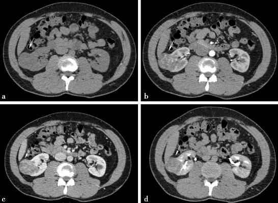 图1a,轴位平扫。图1b~d,动态增强,右肾中极可见一软组织异常密度影,平扫呈等低密度,增强后动脉期可见不均匀性强化,排泄期为低密度