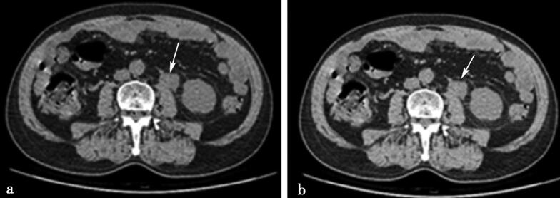 图1a、b,CT平扫横断位图,显示输尿管上段肿块影(箭头所示)