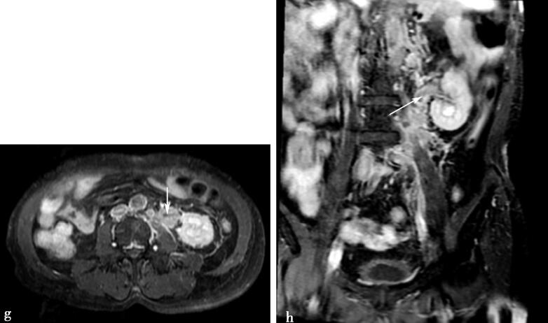 图3g、h,腹部MRI增强扫描,示左输尿管增厚成肿块样,肿块部分中度强化(箭头所示)