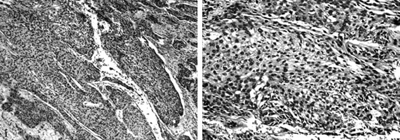 输尿管恶性肿瘤多来自输尿管上皮组织,依组织类型分为移行细胞癌、鳞癌和腺癌,其中以移行细胞癌最为常见,鳞癌和腺癌少见。输尿管移行细胞癌大多为中分化的肿瘤,也有部分肿瘤分化较差。分化良好的肿瘤病灶较局限,其生长方式呈结节状、菜花状、息肉状向腔内突起。管腔横径未完全被肿瘤占据时一般不引起管腔增宽,待肿瘤占据管腔或大于管腔横径时易引起管腔增宽,甚至使管腔呈膨胀性改变。这类肿瘤一般不向管壁外浸润,管壁连续性存在,管壁与周围组织仍可清楚辨认,只是管壁变薄。该类肿瘤很少发生区域性淋巴结增大或远处转移,手术易切除,预后良好。肿瘤细胞分化差的肿瘤其生长方式呈浸润性生长,肿瘤沿输尿管壁向腔内外浸润性生长,受累输尿管范围较长,使输尿管腔狭窄、闭塞,向外浸润周围组织范围广,使输尿管管壁与周围组织界线不清,周围组织水肿,形成团块,并使区域性淋巴结肿大或远处转移,这类肿瘤恶性程度高,手术不易彻底切除,预后差。