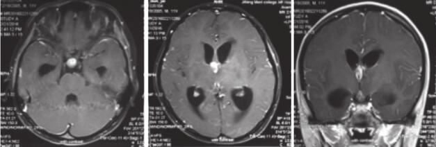 颅内原发肿瘤,起源于胚生殖细胞,好发于儿童及青少年,多见于鞍区、基底节区及松果体区,除局部占位效应外,常可因梗阻脑脊液循环而导致颅内压升高及脑室扩大。影像学多表现为T1等或稍低信号,T2高信号,增强可见均匀强化,边界清楚。该类患者脑脊液检查可见瘤细胞,肿瘤标记物检查,如HCG或AFP,往往可见升高。本例患者10岁男童,颅内多发占位,颅高压症状起病,伴脑室扩大,但影像学表现并不符合典型生殖细胞瘤,且术后病理提示胶质母细胞瘤,暂不考虑此病。