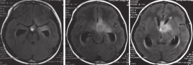 该疾病可分为原发性中枢神经系统淋巴瘤和继发性中枢神经系统淋巴瘤,病程较短,常在半年以内,主要症状及体征因其占位性病变或弥漫性脑水肿引起,可表现为颅高压症状并可伴有精神方面的改变,此外,患者外周血中淋巴细胞比例可见升高,半数患者脑脊液检查可见蛋白质及淋巴细胞的升高。MRI常发现病灶强化明显,呈“棉花糖”样强化。而该患者脑脊液检查未见淋巴细胞升高,病理亦排除淋巴瘤诊断,影像学不支持淋巴瘤诊断,中枢神经系统淋巴瘤可能性不大。