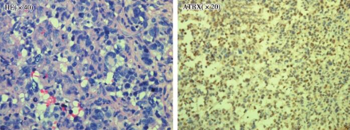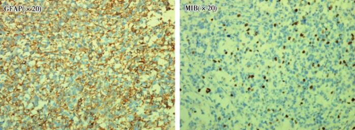 图2 患者术后病理:HE提示患者细胞密度大,核异型大,核分裂处随处可见;ATRX阳性;GFAP阳性;MIB-1 10%左右