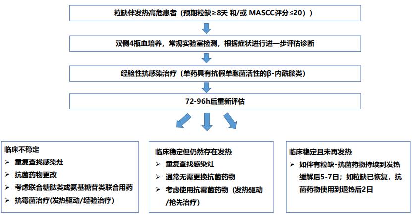 以往指南及学者们通常认为FN应该抗感染治疗至ANC恢复,但缺乏有力的证据支持。现在众多学者认为ANC恢复不是决定抗菌药物应用时间长短的先决条件。①不明原因FN患者,感染症状与体征消失,血流动力学稳定,退热5-7天后推荐停用抗菌药物;②不明原因FN患者,感染症状与体征消失,血流动力学稳定,退热72小时后也可以尝试停用抗菌药物;③临床证实的感染:感染的临床症状与体征消失后患者至少持续72小时以上无发热可以停用抗菌药物;④微生物证实的感染:感染的症状与体征消失,微生物清除,退热至少4天,抗菌药物治疗至少已7天可以停药;上述②③④这几种情况如果停药后粒缺持续,需密切观察患者24-48小时,如果再发FN,立即启动抗感染治疗。