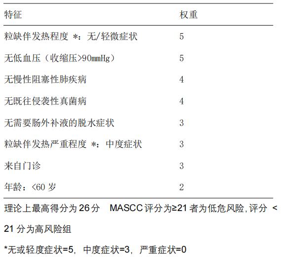 表1 根据MASCC评分对粒缺伴发热患者进行风险分层