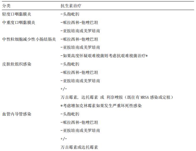 (2)临床诊断感染:临床医生若发现患者存在可疑感染灶,经验性抗感染药物的选择参见附表2。