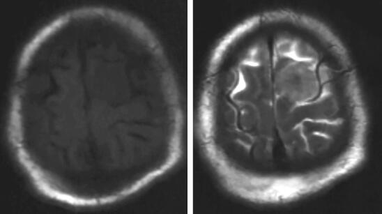 图1 患者2012年头颅MRI平扫提示左额病灶,T1等信号(左),T2等信号(右),未行增强扫描