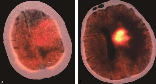 图3 患者头FDG-PET提示左额浅部病灶放射性摄取值轻度增高,SUV值最大8.9(A),左额深部侧脑室上方病灶放射性摄取异常增高,SUV最大值21.6(B)