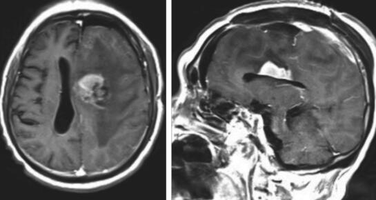 图2 患者2017年复查头颅MRI增强提示左额多发病灶,浅部病灶明显均匀强化;深部病灶不均匀强化,伴坏死
