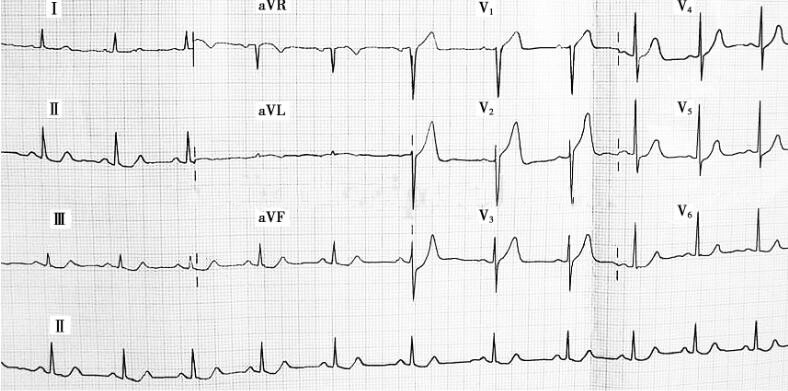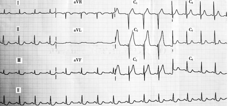 辅助检查(入院当时):心电图见(图1);心肌标记物:CK‐MB 2.2ng/ml;MYO 225ng/ml;TnI<0.05ng/ml。