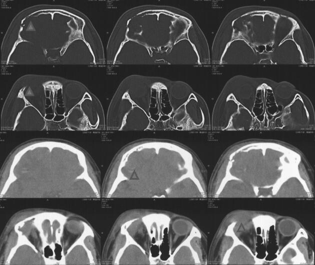 图1 术前头颅CT示额骨、眉弓范围软组织肿块伴骨质破坏吸收