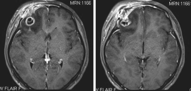 右侧眶上外侧壁及周围软组织水肿略有吸收,右额异常强化灶略有增大