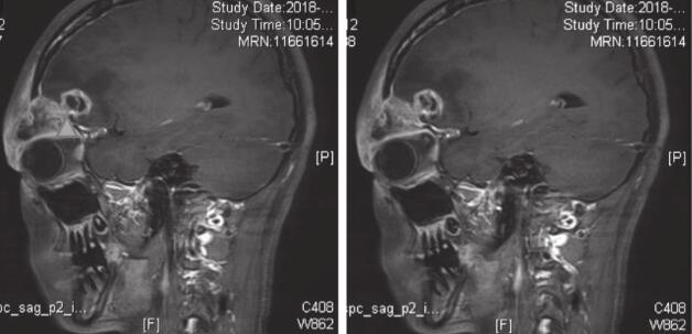 患者,女性,20岁,因“右眼肿痛,伴视物重影1个月,头痛1周”于2018年2月7日入院。2018年1月8日起无明显诱因出现右侧眼睑红肿、胀痛,伴右眼视物重影,无畏光、流泪、流脓,无视野缺损,后红肿逐渐加重,无法睁眼。2018年1月24日至当地医院,考虑“右眼上睑麦粒肿”,给予罗红霉素150mg每天2次,左氧氟沙星液滴眼,妥布霉素/地塞米松眼膏涂右眼,右眼红肿痛继续加重。2018年1月31日开始感右侧额顶部持续性胀痛,无头晕、耳鸣,无恶心、呕吐,无畏寒、发热,至当地医院复诊。行眼眶CT(图1)提示:额骨、眉弓范围软组织肿块伴骨质破坏吸收,并提示右大脑额叶脑水肿、出血可能,拟感染性病变首先考虑;头颅MRI(图2)提示:右侧额骨眼眶外上缘骨质破坏伴右侧额部、颞部、眼睑软组织及右眼上直肌肿胀,右侧额叶环形强化灶伴周围水肿,考虑感染性病变,其他病变待排。