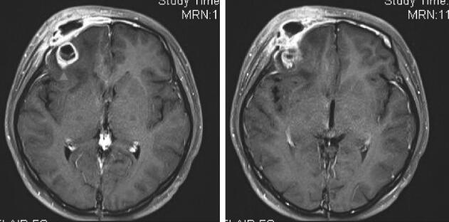 2018年2月7日就诊于我院“多重耐药菌诊治MDT门诊”。查体:头颅无畸形,右侧额窦压痛阳性,左侧额窦无压痛,双侧蝶窦、乳突区无异常,右侧眼睑水肿,红肿,无法睁眼。左瞳孔等大等圆,对光反射灵敏。颈软,无抵抗。生理反射存在,病理反射未引出。查血常规WBC 10.31×109/L,N 67.7%。拟诊“①右眼睑软组织感染;②右额叶肉芽肿:感染可能;肿瘤性疾病待排”收入抗生素研究所病房。既往体健。患者兼职学校图书馆管理员,工作中可能接触发霉图书。
