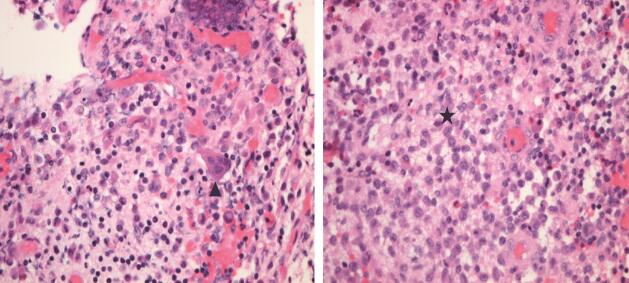 图4 病变组织HE染色病理片可见大量组织细胞,镜下视野上方示多核巨细胞,镜下视野下方示典型朗格汉斯细胞,“咖啡豆”样细胞核(细胞核切迹深),胞质淡染