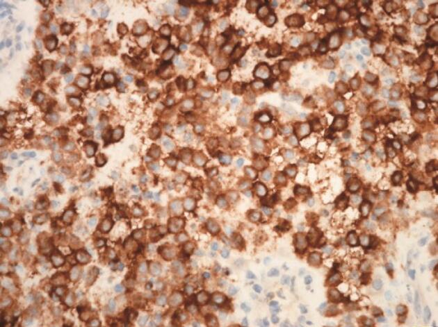 图5 病变组织免疫组化染色见到大量胞质CD1a染色阳性的组织细胞