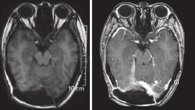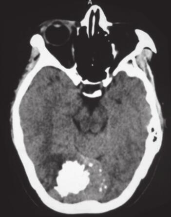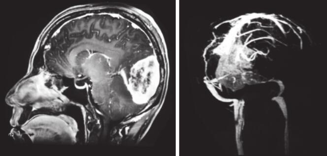 患者自2013年开始间断出现头痛,以顶枕部明显,疼痛可自行缓解,未重视。2016年5月在与家人争吵后,再次出现头痛,且不能缓解。在当地医院行头颅CT发现窦汇区占位,伴有钙化(图1)。2016年7月辗转至华山医院就诊,2016年7月2日行头颅MRI(增强):枕部窦汇处占位,明显强化(图2)。