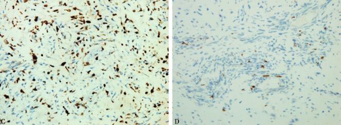A. 低倍:梭形瘤细胞密集排列,席纹状,其间夹杂软骨成分,后者核有异型,可见双核;B. 高倍:瘤细胞异型性大,核染色质浓集,见核分裂象;C. S100阳性表达;D. Ki-67指数8%。肿瘤由两种成分组成,高分化的软骨肉瘤成分和低分化间叶性肿瘤成分相互交错组成