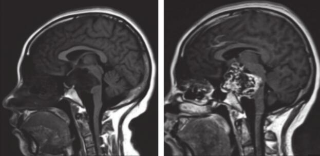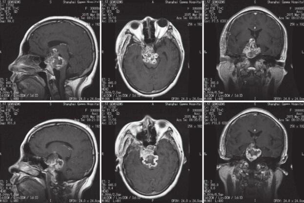 图3 2015-3患者术后接受放疗前MRI,提示鞍上区肿瘤术后改变