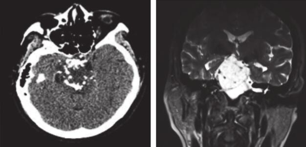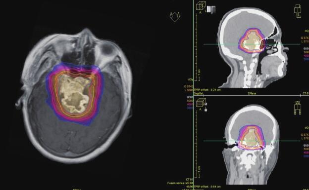 斜坡及鞍上区肿瘤中,依据患者入院MRI怀疑脊索瘤可能,但是根据患者入院CT提示肿瘤钙化明显,颅底骨质无明显破坏,考虑软骨黏液纤维瘤可能;考虑患者肿瘤部分切除,术后长期随访仍有复发可能,结合患者肿瘤生长部位,复发手术难度较大,遂建议术后行放疗,控制肿瘤生长。骨源性肿瘤的放疗剂量高于传统的颅内肿瘤,为了减少对周围脑神经以及脑组织的放射性损伤,推荐采用三维适形技术以及调强技术。新型的质子放疗-重离子技术尤其适合于颅底骨源性肿瘤的放疗,提高疗效,降低放射性损伤的几率和程度。