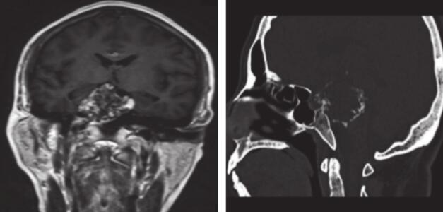 脊索瘤是局部的侵袭性或恶性肿瘤,主要好发于50~60岁的中老年,以颅底蝶枕和骶尾部最常见。脊索瘤生长缓慢,在出现症状前,往往已患病5年以上。脊索瘤的生长虽然缓慢,且很少发生远处转移(晚期可转移),但其局部破坏性很强,CT可以表现出颅底骨质破坏明显,该患者颅底CT未见明显骨质破坏,暂不考虑该诊断。