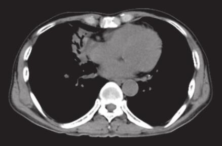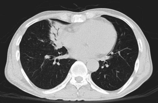 患者,男,57岁,因“发热伴咳嗽24天”于2013年12月10日入院。患者2013年11月15日受凉后发热,体温高达39.5℃,咳嗽,少量白色黏痰,伴有乏力、食欲不振,于2013年12月1日就诊当地医院。门诊查外周血白细胞18.33×109/L,中性粒细胞比例87.6%,ESR 30mm/h,CRP 57mg/L,胸部CT示:右肺上叶纤维条索影,中叶炎性改变,给予“左氧氟沙星”治疗。于当日转诊至某三甲医院,查血液细菌培养及骨髓培养均阴性,气管镜检查黏膜活检示:少许支气管黏膜衬单层柱状上皮,散在慢性粒细胞浸润,给予“哌拉西林他唑巴坦+阿奇霉素”静脉滴注3天后,仍有高热,最高达40.2℃,将阿奇霉素改为万古霉素,用药至2013年12月9日仍有发热,为进一步诊治而入我院。