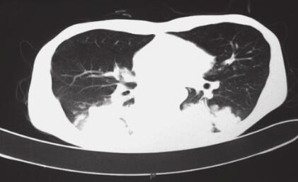 给予糖皮质激素(甲泼尼龙)40mg/d,静脉点滴,2周后逐渐减量,持续3个月,并辅以机械排痰、拍背、体位引流及加强营养等对症处理。治疗1周后患者精神状态明显好转,咳嗽、咳痰症状减轻,发热症状消失。2014年1月27日我院门诊复查胸部CT(图2)对比2013年11月15日CT可见双下肺病灶吸收明显,病灶周围可见高密度小结节影及纤维条索影。