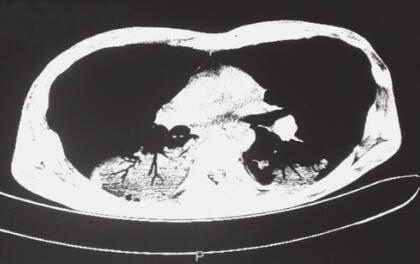 患者,男,45岁,工人。因“咳嗽、咳痰、发热15天”于2013年11月2日入院。自2013年10月18日以来,患者无明显诱因出现咳嗽,咳黄脓痰,量中等,每日约数毫升至10ml不等,伴发热,热型不规则,体温最高40℃,伴胸痛,为钝痛,不剧烈。外院胸部CT检查示“双下肺大片状影,双侧少许胸腔积液”,血液G试验阳性(>1000pg/ml),诊断“肺炎”,给予哌拉西林他唑巴坦联合替考拉宁抗感染,伏立康唑抗真菌,治疗后咳嗽、咳痰等症状缓解不明显,仍间断发热。为进一步诊治转入我院。