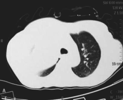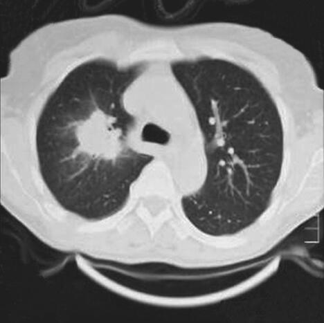 图1 胸片:右肺上野圆形密度增高影