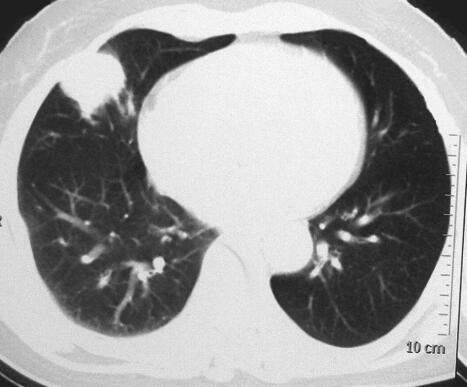 2. 患者无症状,查体无阳性体征。胸部CT提示:右肺中叶团块影,肺肿瘤可能。