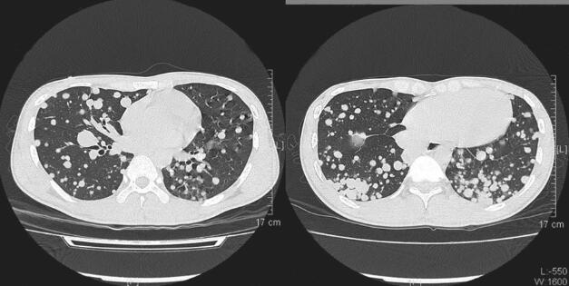 在我科只行诊断未行治疗。追踪患者,后在外院行化疗,方案不详,目前患者仍存活,但肺部结节较前明显增多,气喘症状出现。