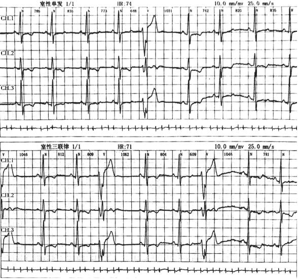 图1 动态心电图提示单发室性期前收缩、室性期前收缩三联律