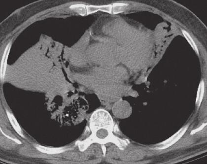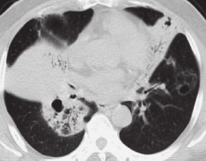 入院后检查:生命体征平稳,全身浅表淋巴结未触及肿大,慢性病容,呼吸平稳,口唇及甲床无明显发绀。胸廓正常,双侧呼吸运动正常,触诊语颤左右两侧一致,双肺呼吸音低,双肺下叶可闻及散在干啰音及少量湿性啰音。心率86次/分,律齐,未闻及明显杂音。腹部查体无异常,双下肢无水肿。血常规:WBC 5.47×109/L,N% 49.9%,L% 40.4%,HGB 132g/L,PL 141×109/L。红细胞沉降率39mm/1h。肝肾功能、生化、C反应蛋白(CRP)、降钙素原(PCT)均未见明显异常。肿瘤标志物:糖类抗原CA125 134.1kU/L,其余均为正常。抗核抗体(ANA)血管炎及ENA抗体谱均正常。结核菌素试验:(-)。3次痰抗酸染色未见抗酸杆菌。3次痰培养均为正常细菌生长。血气分析提示:pH 7.41,PaO2 65mmHg,PaCO2 35mmHg。2014年11月30日肺功能示:FEV1 1.24L,占预计值的56%,FEV1/FVC 68%。肺弥散功能正常。