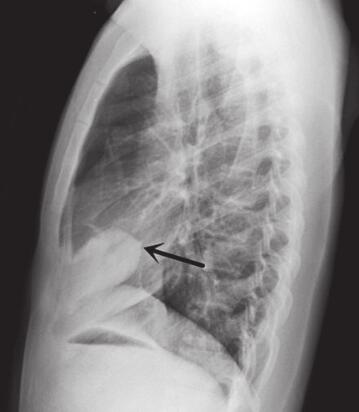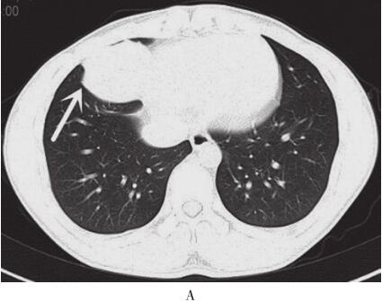 右肺心膈角处见一椭圆形密度增高影,约4.5cm×6.4cm大小,边缘光滑(图A白色箭头),其前缘与胸膜关系密切,后上缘有一尖角与斜裂相连(图B黑色箭头)。右下肺膈顶下方可见一小结节影(图A黑色箭头),侧位显示不清