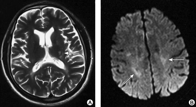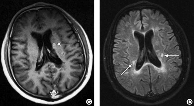注:A.双侧额叶深面、侧脑室旁、半卵圆中心白质内可见多发点状稍长T2信号(箭头);B.双侧额顶叶DWI高信号(箭头);C.增强扫描示左侧基底节区、侧脑室旁见数个斑点状强化(箭头);D.双侧侧脑室旁FLAIR高信号