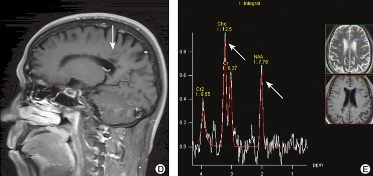 注:A.双侧侧脑室旁、半卵圆中心见多发点片状长T2信号,部分与脑室垂直(箭头);B.右额叶DWI稍高信号(箭头);C.FLAIR像呈稍高信号(箭头);D.增强扫描未见异常强化;E.MRS显示Cho轻度升高、NAA峰轻度下降(箭头)