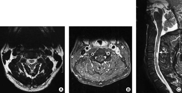注:A~C.C3~C5脊髓稍长T1稍长T2信号,增强扫描呈环形强化。