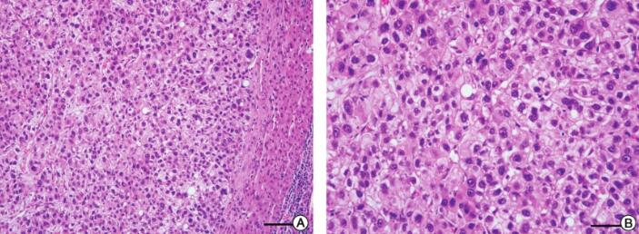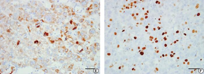 注:A.所检肝脏组织肝硬化不明显,呈现为肝炎后肝癌表现(10μm);B.癌细胞呈多边形,细胞质嗜酸性,细胞核圆形,以梁索状排列为主,梁索之间衬覆血窦(50μm);C~F.免疫组化染色CD-34(+)(50μm),CK8(++)(50μm),Hepatocyte(+)(100μm),Ki-67(+)(50μm)