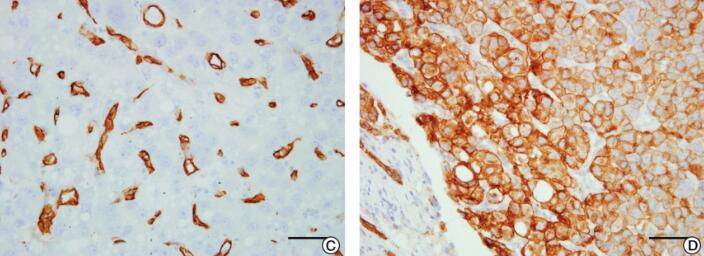 HE及免疫组化染色:所检肝脏组织肝硬化不明显,呈现为肝炎后肝癌表现,癌细胞呈多边形,细胞质嗜酸性,细胞核圆形,以梁索状排列为主,梁索之间衬覆血窦,免疫组化染色见CD-34(+),CK8(++),Hepatocyte(+),Ki-67(+)(图4)。临床病理诊断:肝细胞癌(hepatocellular carcinoma,HCC)。