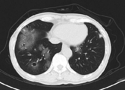 常见曲霉菌、念珠菌感染,好发于免疫抑制宿主,如长时间使用广谱抗生素、糖皮质激素、细胞毒药物及免疫抑制剂等药物,表现为发热、干咳或棕黄色痰、胸痛、咯血、喘息等症状,X线可表现出以胸膜为基底的楔形影、结节或团块影,内有空洞。胸部CT示空洞特点主要为类圆形,两上肺多见,空洞壁厚薄不均或者为均匀薄壁空洞,空洞边缘清楚,内壁光滑,空洞内可有球形结节随体位改变。该患者有咯血,胸部CT示双肺多发散在大小不等薄壁空洞,周围可见磨玻璃渗出影,真菌感染不除外。入院后多次送检痰培养为白念珠菌,痰涂片找真菌可见真菌孢子及菌丝。但患者仅表现为咯血,免疫功能大致正常,无真菌感染高危因素,且深部真菌感染症状常常较为凶险,经验性抗真菌治疗后双肺病灶仍有进展,真菌感染可以除外。