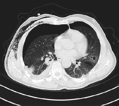患者,男,55岁,农民。因“间断咯血2个月余,气短10天”于2014年12月21日入院。入院前2个月余患者无明显诱因出现咳嗽、咳痰、痰中带血,鲜红色,量少,每日2~3口,无发热、胸痛、胸闷、气短等,自行口服消炎药物无效(具体药物不详),遂相继就诊于某三甲医院及某教学医院,行胸部CT示双肺多发空腔样薄壁空洞,周围可见晕征,诊断为“双肺病灶性质待查 双肺肺炎?”,给予“哌拉西林舒巴坦、伏立康唑、左氧氟沙星、甲硝唑”等抗感染及止血治疗,效果稍好转后出院,出院后仍有咳嗽、咳痰及痰中带血。入院前10天无明显诱因出现气短,平步行走即感气短明显,咳嗽、咳痰及痰中带血症状持续存在,当地村卫生所给予对症治疗(具体不详),效果差,求进一步诊治来我科就诊。入院后查体:体温36.9℃,脉搏92次/分,呼吸42次/分,血压125/84mmHg,慢性病容,呼吸急促,口唇发绀,咽部无充血,扁桃体无肿大;右肺未闻及呼吸音,左肺呼吸音粗,心率92次/分,律齐,各瓣膜听诊区未闻及病理性杂音;腹软,无压痛、反跳痛,肝脾肋下未及;双下肢无水肿。辅助检查:胸部CT(2014年11月6日,某三甲医院):双肺多发斑片影,左肺舌段及左下肺分别可见薄壁空腔样空洞病灶,病灶周边可见晕征,右侧气胸(图1)。胸部CT(2014年11月21日,某教学医院):双肺囊样空腔病灶增多,双侧气胸,右侧胸腔气体量较前增多(图2)。胸部CT(2014年12月21日,本院):左舌段空腔病灶较前增大,左下叶基底段出现疑似空洞病灶,病灶周边可见斑片影,双侧气胸,以右侧为主,右肺受压不张(图3)。血气分析(2014年12月21日,本院,未吸氧):酸碱度7.366,二氧化碳分压45.6mmHg,氧分压40mmHg,氧饱和度71.4%。