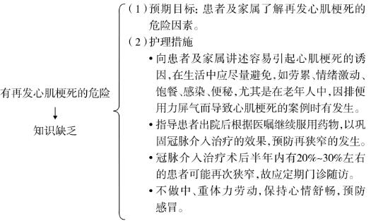 患者从发病到救治的成功,护理上给予了一系列的护理方案的实施。入院时监测意识、瞳孔的变化,予心电监护,吸氧,记录24小时出入量,正确滴注大量补液,胰岛素降糖,严密监测血糖等护理措施,保证了对心肌梗死这类糖尿病急性并发症的有效的抢救配合;住院期间,及时行经皮冠状动脉介入治疗,治疗后做好拔除鞘管护理,面对患者神志迟钝,躁动不安等心境障碍表现,家属积极给予帮助,早期制订实施方案,用针对性的护理手段解决患者及家属可能存在的护理问题,为恢复期奠定了基础。恢复期重点是对患者及家属进行糖尿病知识和预防再发心肌梗死教育,以保证出院后,患者能进行良好的自我管理;同时提供各种措施稳定患者情绪,减轻患者焦虑情绪。