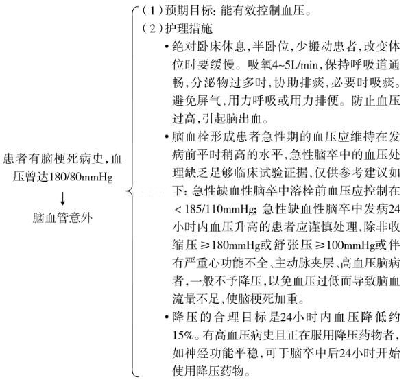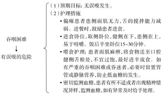 患者8年前因脑梗死住院时发现血糖升高,诊断“2型糖尿病”。予以口服降糖药治疗。2年前曾发生脑梗死,遗留左下肢活动不利。5天前无明显诱因出现左下肢活动不利加重,行走不稳,伴言语不利。1天前出现恶心、呕吐1次,为胃内容物。在神经内科门诊测血压180/80mmHg,头CT未见出血灶,随机血糖17.8mmol/L。给降糖、活血等对症治疗后症状略好转。为进一步治疗以轮椅推入笔者医院科室。如何护理?