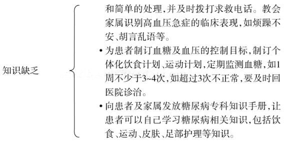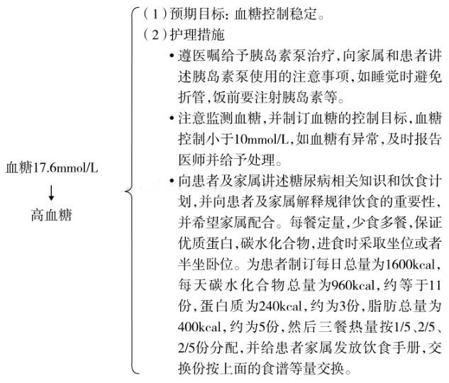 (2)患者的血糖不稳定,遵医嘱给患者服用降糖药,给患者和家属做好健康教育,为患者设定近期血糖的控制目标。