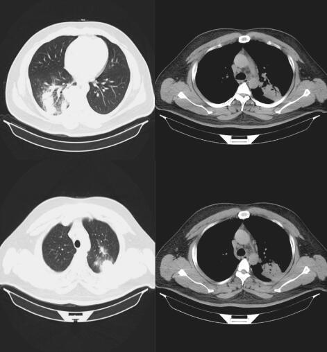 患者,男,34岁,公司销售员。因“发热伴咳嗽1个月余”于2014年12月19日入院。患者于2014年11月起无明显诱因下出现发热、咳嗽,程度较重,呈刺激性咳嗽,偶有咳痰,痰呈脓黄痰,偶伴有痰中带血;最高体温38℃左右,发热多为午后,伴有盗汗,无呼吸困难、胸痛、气促等表现;初自服头孢拉定(2粒,3次/天)无好转,遂到区中心医院门诊就诊,血常规示WBC 11.4×109,N% 78.9%,给予头孢呋辛抗感染1周,症状无改善,仍有发热、干咳伴盗汗;2014-11-15收住该院呼吸科病房,遂给予帕尼培南-倍他米隆及左氧氟沙星抗感染治疗1周余,影像学仍有进展,后更换为注射用头孢哌酮钠舒巴坦钠(3.0g,静脉滴注,2次/日)、万古霉素(0.5,静脉滴注,每8小时1次)抗感染,孟鲁司特钠控制气道高反应,同时给予氨溴索化痰、二羟丙茶碱止喘、可待因止咳、标准桃金娘油肠溶胶囊化痰,治疗半月患者体温仍持续不退,发热多于午后,体温在38.5℃以下,咳嗽剧烈伴明显盗汗加重转笔者科室。发病以来,神清、精神萎,体重减轻5kg。