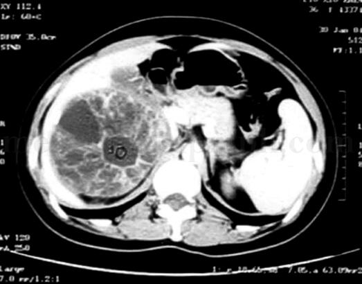 超声:右肾区可见一直径9cm的肿物,其内回声不均,可见多个囊实性改变,囊壁欠光滑,有钙化。
