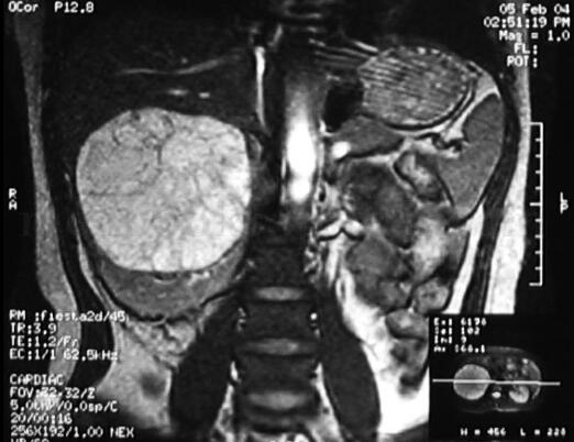 MRI:右肾上极类圆形囊实性占位,呈T1低,T2高,内部信号不均匀,可见散在T2低信号的分隔,肾下极受压成新月形,肝脏受压上移。腹膜后未见肿大淋巴结(图2)。