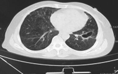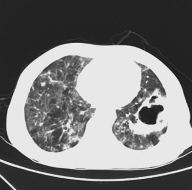 入院后检查:生命体征尚平稳,急性病容,呼吸急促,有发热,体温38.6℃,双肺散在湿性啰音。心律齐,心率快,114次/分,各瓣膜听诊区未闻及杂音,腹部无明显阳性体征,双下肢无水肿。脑膜刺激征阴性,病理征未引出。血常规:WBC 18.3×109/L,N% 94.1%,HGB 108g/L,PLT 130×109/L。红细胞沉降率:96mm/h。PCT 18.7ng/ml,BNP 15 200pg/ml,肝肾功能未见明显异常。低钠血症,低钾血症,结核菌素试验(+)。3次痰抗酸染色未见抗酸杆菌。3次痰培养未发现致病菌。血气分析(吸氧2L/M)提示:pH 7.492,PaO2 59.3mmHg,PaCO2 16.3mmHg。抗核抗体(ANA)、ANA谱、dsDNA抗体及抗中性粒细胞抗体均正常。钩端螺旋体抗体、恙虫病抗体、流行性出血热抗体均阴性。真菌D-葡聚糖+曲霉菌半乳甘露聚糖抗原:均正常。HAV+HIV+HCV+TPPA抗体:均正常。呼吸道感染病原体IgM抗体:呼吸道合胞病毒-IgM抗体阳性(+),余均阴性。(2014年6月29日)肺部CT平扫(图1):):①双肺弥漫性病变伴空洞形成,肺炎并脓肿?肉芽肿性病变?②左下肺脓肿形成。