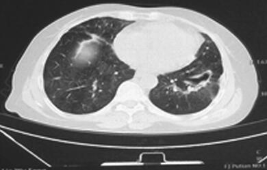 抗生素改用美罗培南、复方磺胺甲噁唑片抗感染,并给予丙种球蛋白静脉滴注,3天后患者体温逐渐下降至正常。血培养未再发现病原菌,继续使用抗生素21天后,患者病情稳定,症状明显好转,复查肺部CT病灶(图2)较前有吸收,给予出院,继续口服复方磺胺甲噁唑片、阿莫西林/克拉维酸钾,并门诊随访,2014年12月1日复查肺部CT(图3),病灶较前明显吸收。